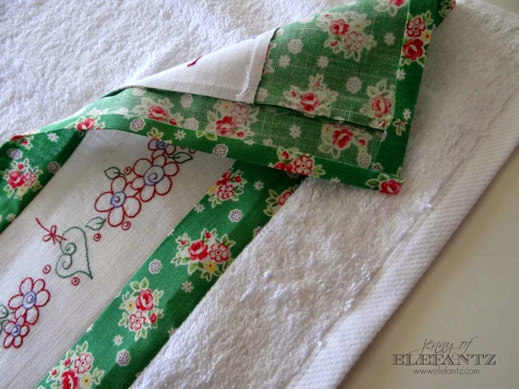If your towel measures 17" add an extra 1/2" (w) to the two small pieces of fabric and an extra 1" to the long pieces. Just make sure your total width will be 1" wider than your towel is, ok?