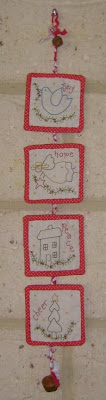 I finished the large Christmas Sack in October, but not much has been done since. Yesterday, while listening with Blossom to "The Voyage of the Dawn Treader" I remembered four little embroideries I'd done (from a Homespun issue a year or two back), but not decided how to use. The orginal design had used them as tree ornaments with little scalloped bottoms, but in keeping with the red and white theme Blossom and I have decided on for 2008 I edged them with red spot fabric, added red and gold seed beads to the embroideries, then plaited red and white fabrics as a hanging cord. I added some left over rusty bells from the Christmas Sack and it was completed!