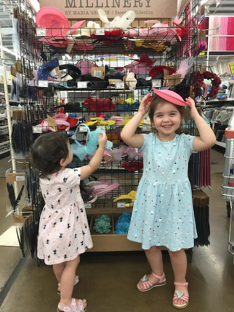 Anyhow, when we were walking through the aisles of fabric the little girls discovered a large stand of hats, alice bands and fascinators. Well, you know what happened next, right??