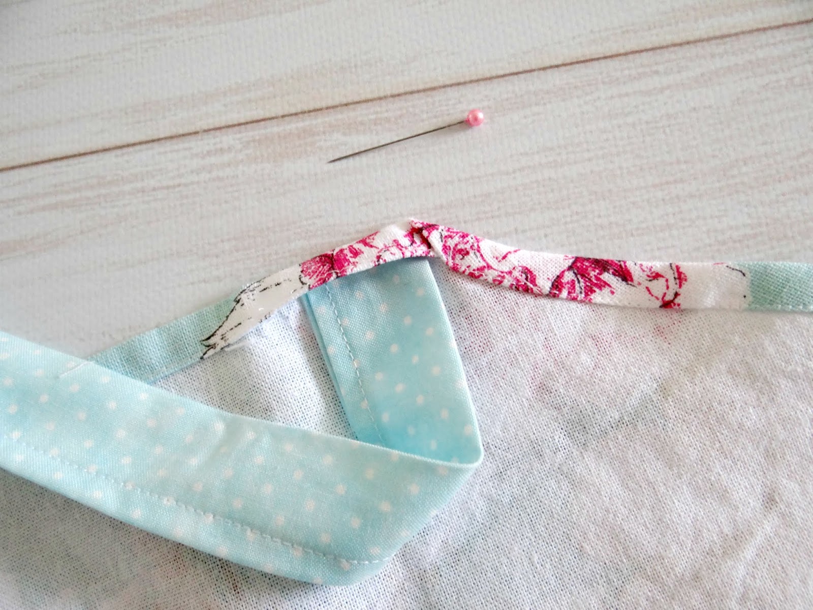 To make the neck ties follow the same steps with the 2" x WOF length of fabric but this time curve both narrow ends, enclosing them - then cut the tie into two equal lengths.