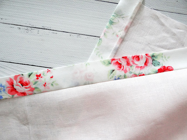 You will need to cut four, 3" wide lengths of fabric, slightly longer than the length/width of your cloth. Regular quilting fabric such as the floral print I used, measure around 43"to 44" from selvedge to selvedge, so I simply cut my 3" wide pieces from that.
